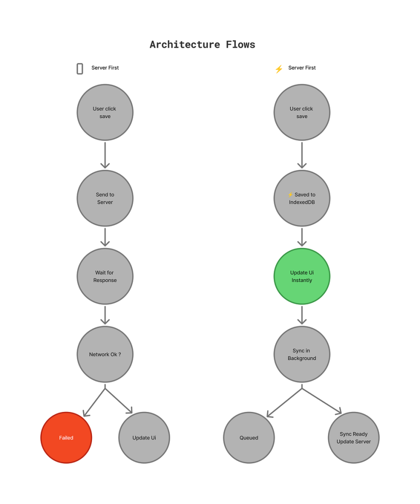 The difference: The user does not feel delayed. The app works offline. When the connection comes back, it automatically syncs.