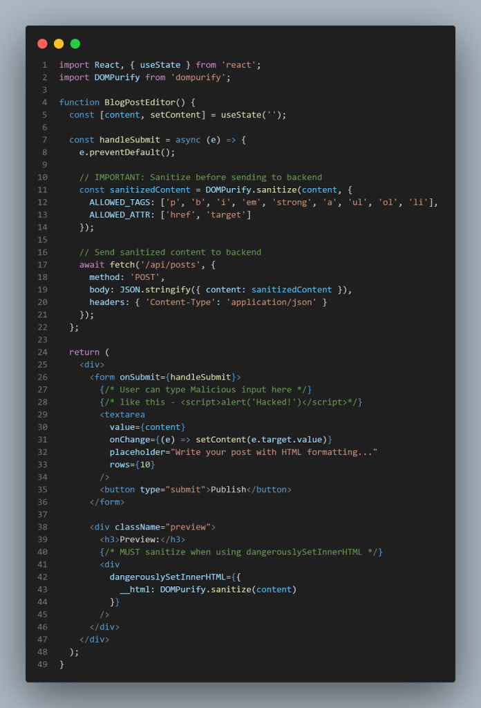 React automatically protects you from normal text rendering. Use DOMPurify if you need to render HTML or as an extra layer of security when sending data to your backend. Remember: authentication checks the format, cleanliness removes threats.