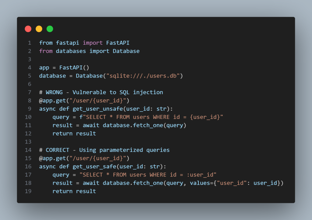 Parameterized queries treat user input as data, not executable code. Even if an attacker tries to control’ OR ‘1’=’1, the database searches for a user literally named “admin’ OR ‘1’=’1” instead of making a false sense.